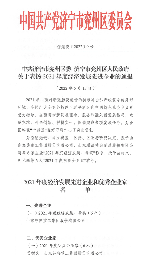 5月15日,兗州區(qū)委區(qū)政府發(fā)布《關(guān)于表?yè)P(yáng)2021年度經(jīng)濟(jì)發(fā)展先進(jìn)企業(yè)的通報(bào)》,授予山東經(jīng)典重工集團(tuán)股份有限公司“2021年度經(jīng)濟(jì)發(fā)展一等獎(jiǎng)”稱號(hào),授予經(jīng)典集團(tuán)董事長(zhǎng)苗樹文“2021年度明星企業(yè)家”稱號(hào)。