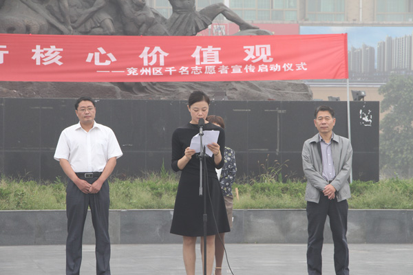 儀式由王仁娜副區長主持。區委宣傳部副部長邢衛紅宣讀了《兗州區弘揚社會正能量踐行核心價值觀倡議書》。集團公司志愿者卞中凱作為全區企業屆代表作了表態發言。儀式上頒發了活動宣傳書籍和資料。初建偉部長作了重要講話?;顒幼詈?,廣大志愿者們在活動條幅上鄭重簽下了自己的名字。