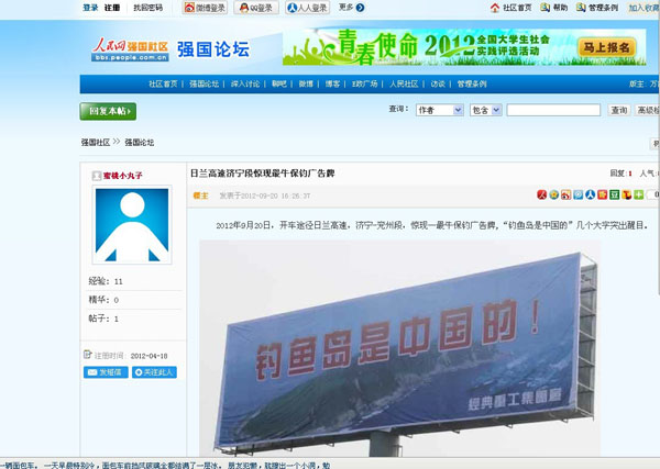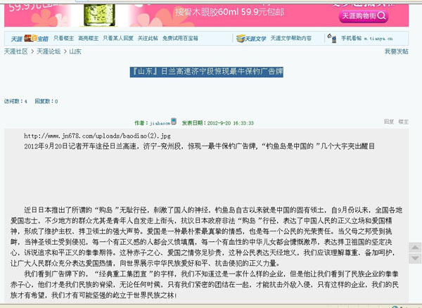 近一段時期以來日本推出了所謂的“購島”無恥行徑,刺激了國人的神經,我們集團作為中華民族大家庭的一員,有責任也有義務保衛我們祖國領土的完整,和不容侵犯,為此集團領導代表集團全體員工通過各種方式彰示了我們的愛國熱情,并付諸于實際行動斥巨資在日蘭高速濟寧段制作了高炮廣告“釣魚島是中國的”以顯示我們保釣之決心。