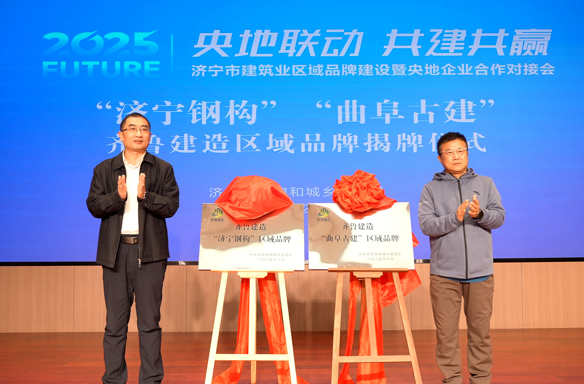 市住建局李振副局長、市建筑業(yè)協(xié)會郭志明會長共同為“濟寧鋼構(gòu)”“曲阜古建”齊魯建造區(qū)域品牌揭牌