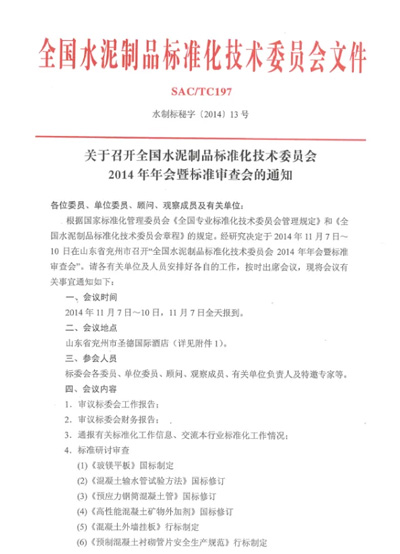 11月7日-9日全國(guó)水泥制品標(biāo)準(zhǔn)化技術(shù)委員會(huì)2014年年會(huì)暨標(biāo)準(zhǔn)審查會(huì)在山東天意機(jī)械股份有限公司隆重召開。屆時(shí),委員會(huì)相關(guān)領(lǐng)導(dǎo)及行業(yè)相關(guān)科研人員將蒞臨會(huì)議,共同商討制訂行業(yè)有關(guān)標(biāo)準(zhǔn)。誠(chéng)邀各界人士屆時(shí)蒞臨天意機(jī)械、經(jīng)典集團(tuán)、卓越精工參觀指導(dǎo)。