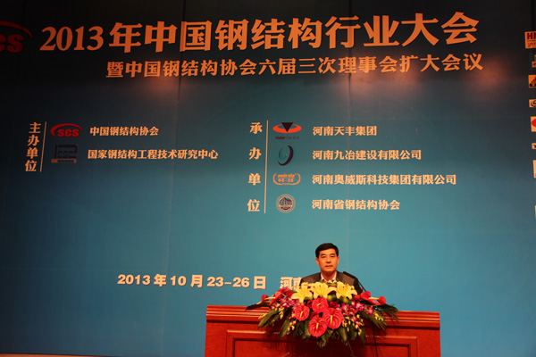 1023-26日,2013年中國鋼結構行業大會暨中國鋼結構協會六屆三次理事會擴大會議”在河南鄭州黃河迎賓館召開。會議由中國鋼結構協會、國家鋼結構工程技術研究中心主辦;河南鋼結構協會單位承辦。會議邀請了國務院國資委行業協會聯系辦公室副主任張濤、河南省人大常務委員會副主任儲亞平、中國鋼鐵工業協會常務副會長朱繼民、中國鋼結構協會會長(中冶建筑研究總院院長)岳清瑞、常務副會長劉毅、副會長賀明玄、秘書長劉萬忠及副會長、常務理事單位等出席會議。經典集團董事長苗樹文、生產總經理王忠策等公司領導參加了此次大會,經典集團榮獲中國鋼結構協會第六屆理事會理事單位,苗樹文董事長為中國鋼結構協會第六屆理事會理事。