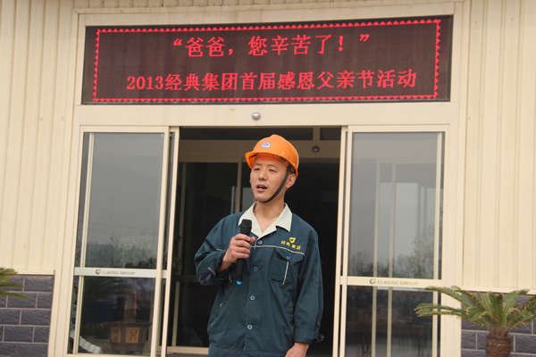 2013年6月16日上午7點30分,經典集團開展2013年度父親節“送溫暖,獻愛心”活動,為集團全體員工的父親送上愛心手機,千元節日紅包,集團董事長苗樹文,總經理杜福生及高層領導先后致辭并發放獎金及手機。活動舉行完后,經典集團總經理杜福生親自到部分員工家中為員工父親送上集團的問候與節日祝福。