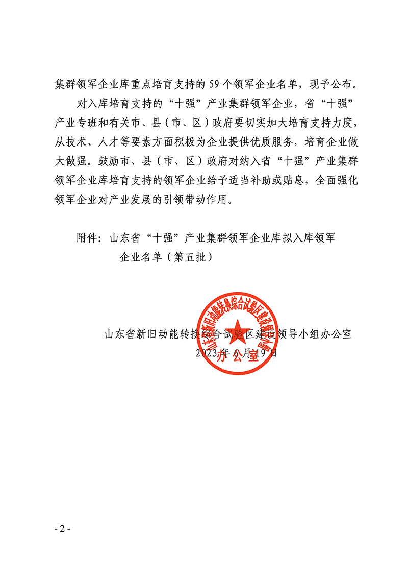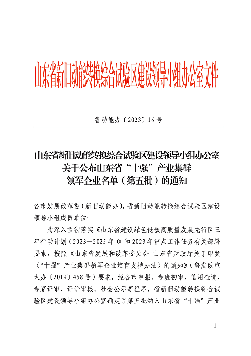 6月19日,山東省新舊動能轉換綜合試驗區建設領導小組辦公室發布了《關于公布山東省“十強”產業集群領軍企業名單(第五批)的通知》(魯動能辦【2023】16號),山東經典重工集團股份有限公司成功入選山東省“十強“產業集群領軍企業名單。